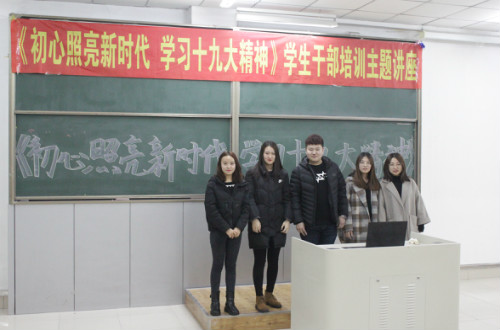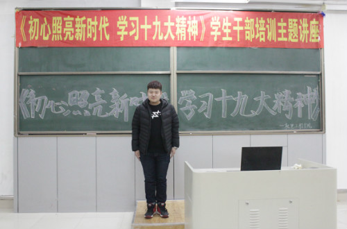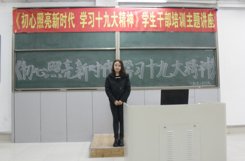 通过今天的学生干部培训讲座使我意识到自己的使命,要做新时代的有为青年,要坚定信念勇敢担当。在今后的学习、工作中,要坚持用十九大精神武装头脑,要不断提高自己的综合素质,用知识、技能服务社会,用自己的实际行动为实现中国梦而努力奋斗。