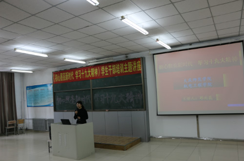 讲座开展前的一周,邓雨巍书记开始深入调查学生对十九大精神的了解情况,与学院教师们进行多次会议商讨,如何将十九大精神、习近平新时代中国特色社会主义思想带入校园,学生干部积极配合老师工作,带领学生们在课余时间建立小组共同探讨学习十九大精神。每日黄昏过后,邓书记的办公室里总是灯火通明,彻夜修改稿件,为在讲座中更全面的向学生们传达党的十九大精神做着充分准备。她围绕在新时代进程中擦亮初心、在民族复兴中坚守初心、在自我革命中砥砺初心三个视觉角度,就大学生如何理解习近平新时代中国特色社会主义思想进行了深入浅出的生动解读。