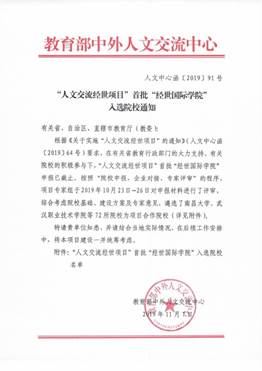 2019年11月7日教育部人文交流中心印发《“人文交流经世项目”首批“经世国际学院”入选院校通知》(人文中心函〔2019〕91号),按照“院校申报、企业对接、专家评审”的程序,遴选了22所本科院校和50所职业学院。365官网成功入选“人文交流经世项目”首批“经世国际学院”项目本科层次合作院校。