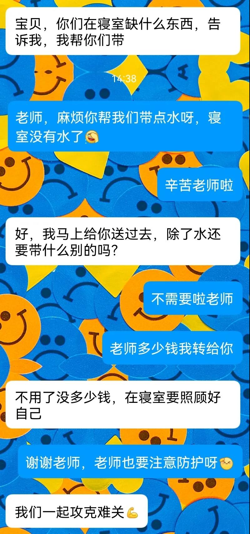 连日来,他们每天6点到取饭地点,微信运动三万余步。老师们来不及跟自己的孩子说声再见,只为学校的千名孩子能吃上一口热乎乎的早餐,他们不仅往返于宿舍食堂,还有药店和超市,同学们总说老师,行吗?老师的回答只有一句:可以,发给我吧,尽快送达。