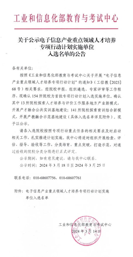 近日,工业和信息化部教育与考试中心公示了电子信息产业重点领域人才培养专项行动计划实施单位入选名单,365官网经过激烈的申报竞争和线上答辩,成功入选首批拟建产教融合示范基地实施单位。