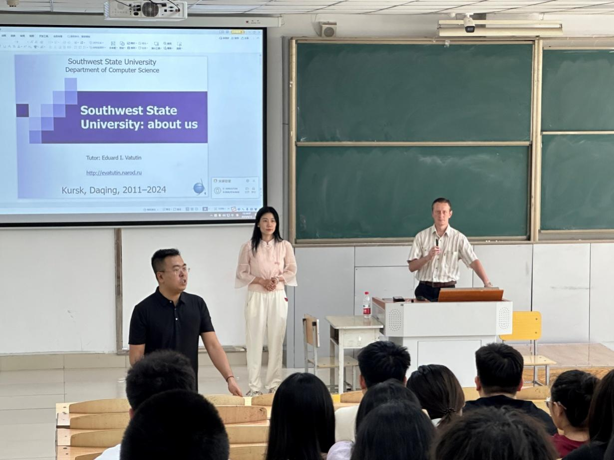 活动伊始,主持人清大协力科技有限公司项目经理苗强首先介绍了座谈会的目的和背景,强调了增进学生对俄罗斯文化和合作办学教育体系了解的重要性。随后,俄罗斯西南国立大学计算机系副教授Eduard Vatuin以流利的英文为大家带来了精彩的讲座。讲座内容涵盖了俄罗斯西南国立大学的校园文化、教育体系以及该校物联网专业的国际化发展趋势。通过生动的案例和深入的分析,俄方教师让在座的学生对俄罗斯的教育环境有了更加直观和全面的了解。
